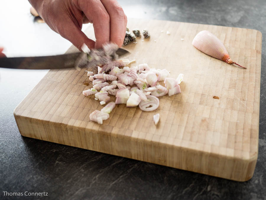 - Schalotten, Cornichons, Kapern, Oliven hacken