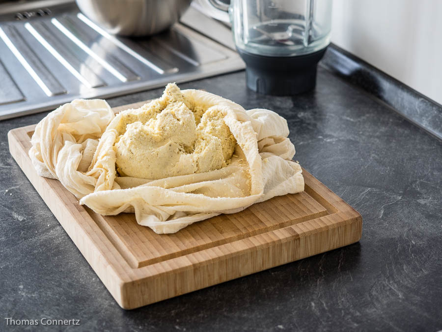 “Meat the Green” ist ein schönes Kochbuch, aber leider sind die Zutaten für die Rezepte nicht immer leicht zu bekommen. Vielleicht liegt das daran, dass ich kein Veganer bin und einfach die Einkaufsquellen nicht kenne. Aber z.B. das auch im Auberginen-Tartar verwendete Okara kann man meines Wissens nicht kaufen. Es zu verkaufen wäre auch eine ziemliche Frechheit, weil es eigentlich nur ein Abfallprodukt der Tofu-Herstellung ist. Weil ich’s unbedingt ausprobieren wollte, habe ich also Tofu selbt gemacht.