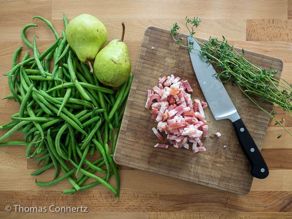 Mische die Speckwürfel, die gebratenen Birnenstücke und die Bohnen. Schmecke noch einmal ab und serviere sofort.
