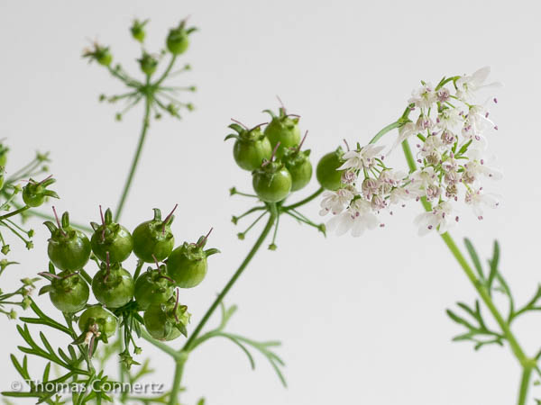 Kori­an­der hat hüb­sche wei­ße Blü­ten, die bei aller­lei flie­gen­dem Getier beliebt sind. Und wie das so ist bei Bien­chen und Blüm­chen, wis­sen wir ja aus dem Auf­klä­rungs­un­ter­richt (heisst das heu­te noch so?). Nach eini­gen Wochen bil­den sich grü­ne Kno­ten, die unge­fähr so groß sind wie Steck­na­del­köp­fe – die Kori­an­der­sa­men.