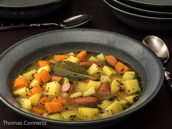 Kartoffelsuppe ist schnell gemacht und wärmt die Seele und den Magen. Nicht gerade ein Sonntagsessen, aber ein einfacher Eintopf für jeden Tag. Genauso köstlich in der vegetarischen oder veganen Variante wie in der fleischhaltigen.