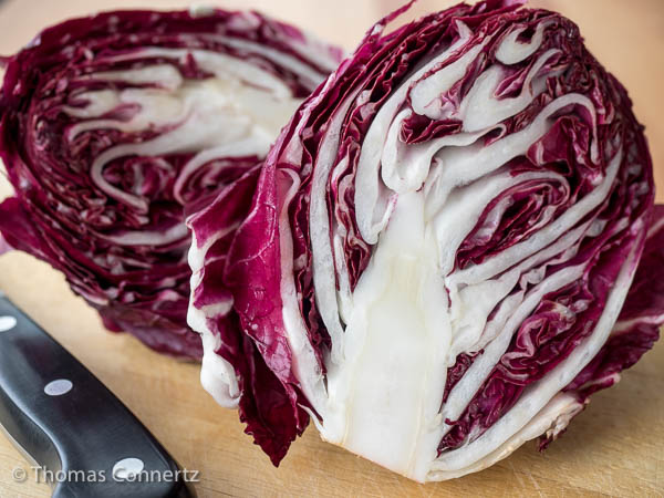Hier stelle ich eine Zubereitungsvariante ohne Knoblauch, aber dafür mit Olivenöl und Zitronensaft vor. Die Säure des Zitronensafts balanciert die leichter Bitterkeit des Radicchio aus, das Olivenöl und der Thymian runden den Geschmack ab.