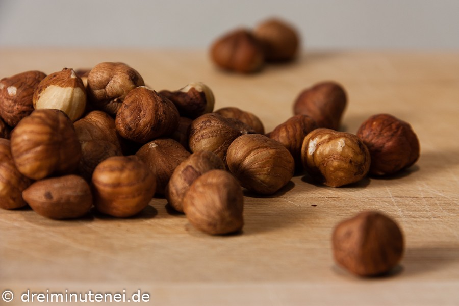 Röste die Haselnüsse in einer trockenen Pfanne bei mittlerer Hitze, bis die Haut Risse bekommt. Rubbel sie zwischen zwei Lagen eines sauberen, trockenen Küchenhandtuchs heftig ab, damit die Schale abgeht. Hacke die Nüsse in nicht zu kleine Stücke.