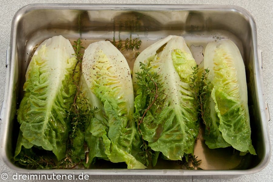 Schneide die braunen Stielenden von den Salatherzen ab und entferne braune oder welke Blätter. Packe sie nebeneinander in eine ofenfeste Form. Sie sollten nicht übereinander liegen, aber auch nicht zu viel Platz zwischen sich haben.