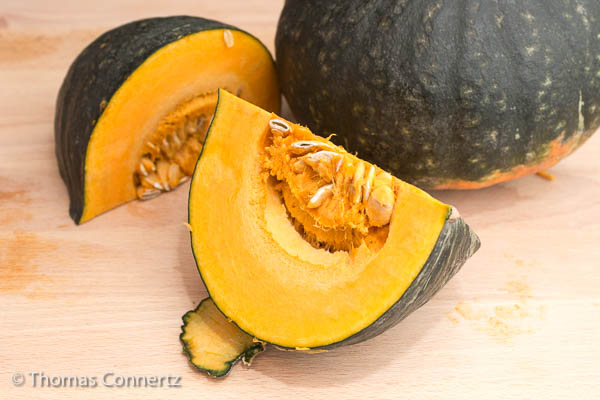 • Ich habe Kabo­cha-Kür­bis genom­men, weil mir der Farb­kon­trast zwi­schen dun­kel­grü­ner Scha­le und oran­ge­far­be­nem Frucht­fleisch gefällt. Aus dem glei­chen Grund habe ich lila Möh­ren ver­wen­det. Es geht aber auch jede ande­re Sor­te Kür­bis (man­che Sor­ten, wie z.B. But­ter­nut, musst Du schä­len), und nor­ma­le Möh­ren tun’s auch.