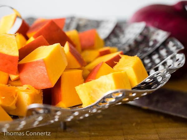 Dämpfe die Kürbiswürfel in einem Dämpfeinsatz über kochendem Wasser, bis sie weich sind. Das dauert ungefähr 20 Minuten, je nachdem, wie groß Du die Würfel geschnitten hast.