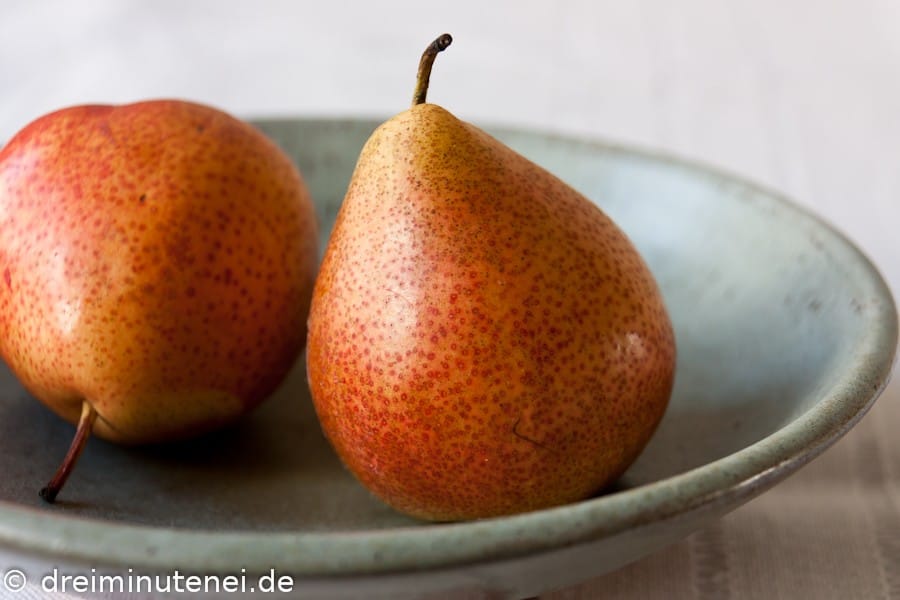 Während das Fleisch brät, putzt Du die Frühlingszwiebeln und schneidest das Weiße schräg in Ringe. Schäle die Birnen, entferne das Kerngehäuse und schneide sie in dünne Scheiben.