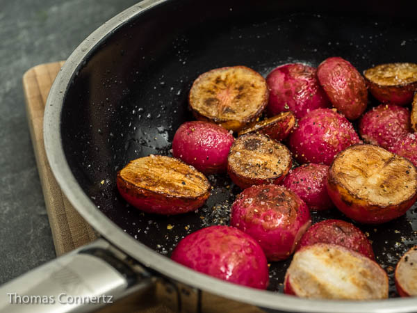 Beim Bra­ten (gene­rell beim Erhit­zen) ver­lie­ren die Radies­chen etwas von ihrer Schär­fe. Ihre Koh­le­hy­dra­te kara­mel­li­sie­ren, was einer­seits für die appe­tit­li­che brau­ne Far­be sorgt, ande­rer­seits für eine gewis­se Grund­sü­ße, die sich mit etwas Honig und Salz sehr schön her­aus­ar­bei­ten lässt.