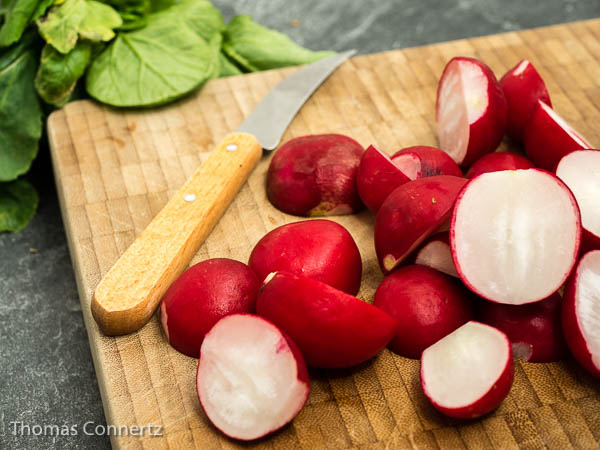1. Das ist eine schö­ne Idee, die ich dem­nächst aus­pro­bie­ren wer­de, sobald frisch geern­te­te Radies­chen zu haben sind.