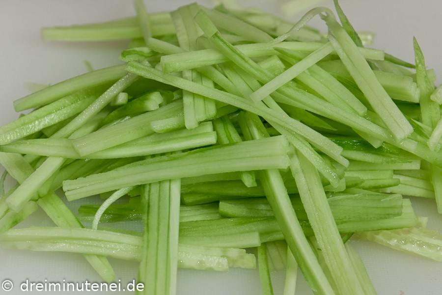 Das Originalrezept stammt aus dem Buch »Chinesisch kochen ganz easy« der Taiwanesin Ching-He Huang (Dorling Kindersley 2010). Es enthält viele schöne Rezepte, aber leider völlig unrealistische Zeitangaben. Bzw. behilft sich mit einem Trick, um die Vorbereitungszeiten kurz zu halten: statt z.B. die Zeit einzurechnen die Du für’s Gurkeschneiden brauchst, stehen einfach Gurkenstreifen in der Zutatenliste.