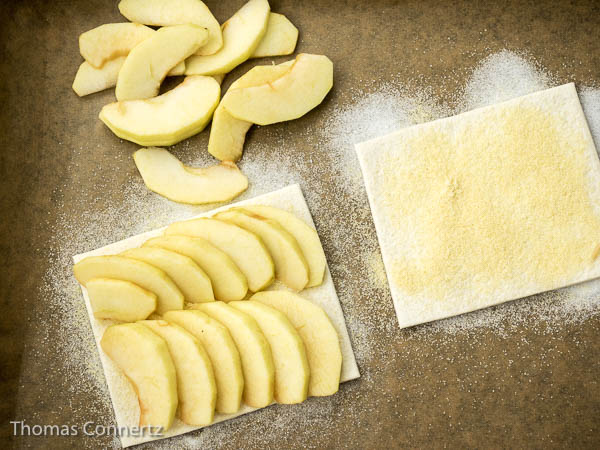 Lege die Blätterteig-Scheiben auf den Zucker und drücke sie etwas an. Bestreue sie mit Gries – er verhindert, dass der Teig beim Backen von den Äpfeln feucht wird.