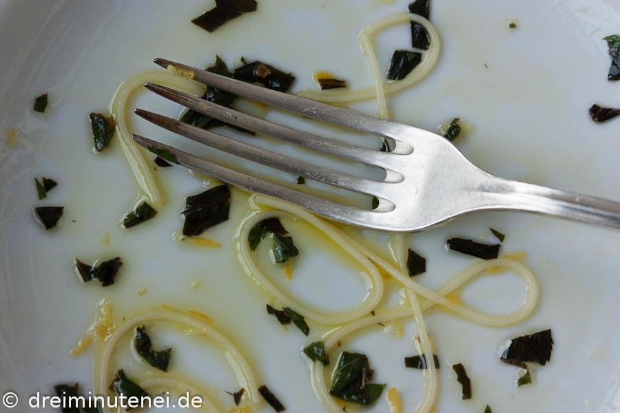 Spaghetti mit Minze und Zitrone dürfte so ungefähr zu den schnellsten Pasta-Gericht zählen, die es es gibt. Wenn Du Spaghettini oder Capellini nimmst, sogar zu den allerschnellsten. Du kannst auch Bavette verwenden. Eigentlich geht jede lange dünne Sorte Pasta.