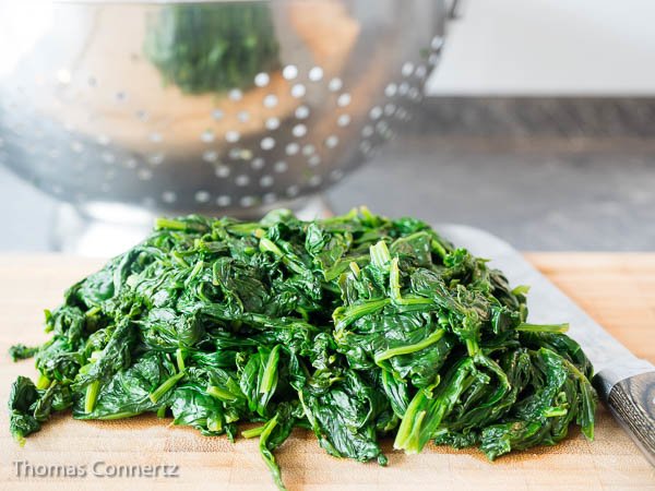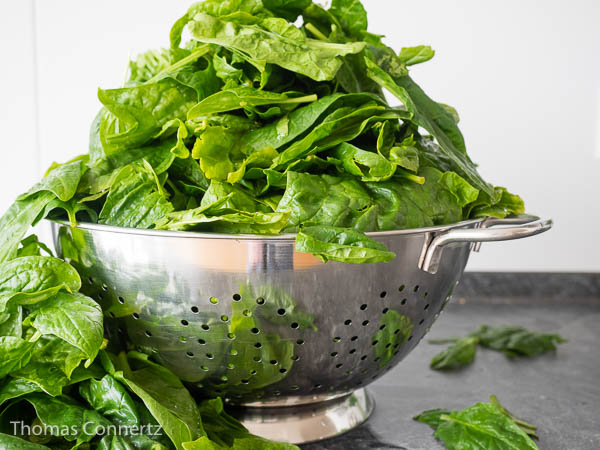 - Lass‘ Dich nicht von der scheinbaren Riesenmenge Spinat irritieren – er fällt beim Garen stark zusammen.