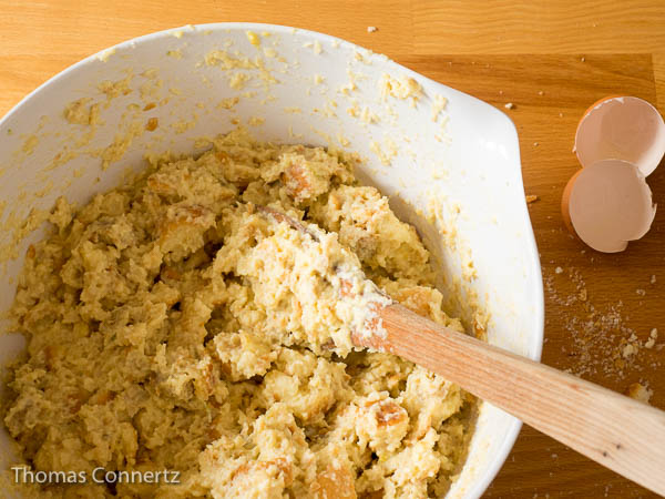 Es sollte ein recht fester Teig entstehen. Wenn er zu weich ist, mischst Du noch etwas Mehl unter. Der Teig ist gut, wenn es ziemlich anstrengend wird, ihn mit dem Löffel zu verarbeiten.