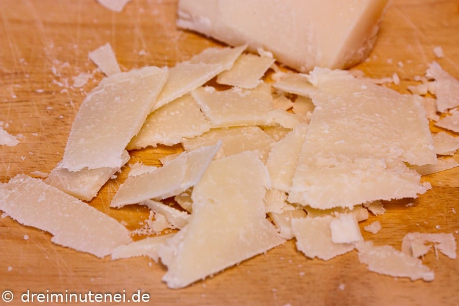 Wasche und putze den Rucola. Hoble den Parmesan in dünne Scheiben.