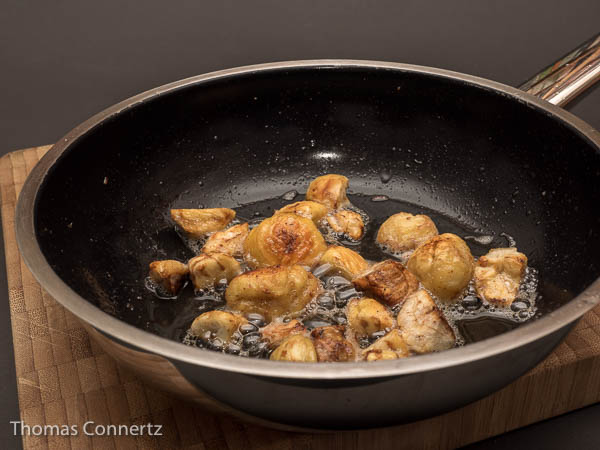 Erhitze das Fett in einer ausreichend großen Pfanne und bräune die geschälten Maronen darin bei mittlerer Hitze. Schwenke die Pfanne hin und wieder, damit die Maronen von allen Seiten schön braun werden.