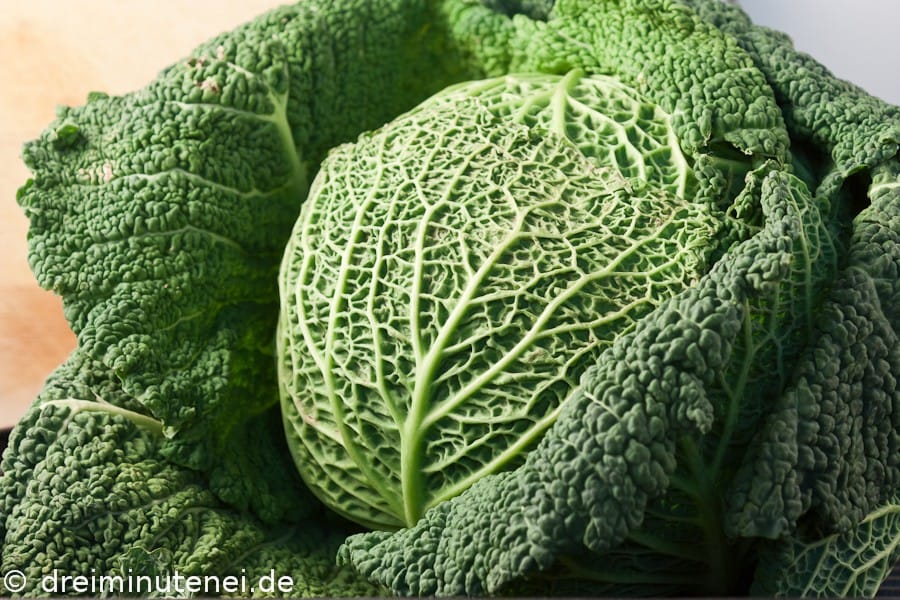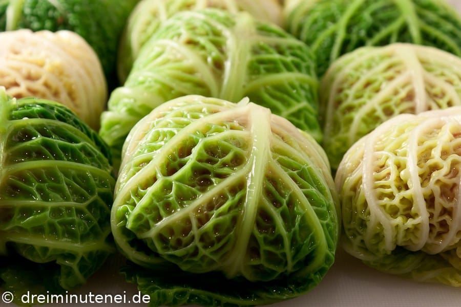 Statt Wirsing kannst Du auch Weißkohl verwenden. Der ist aber viel schwerer zu verarbeiten, weil die Blätter glatter sind und dichter aufeinander liegen. Deshalb sind sie extrem schwer abzutrennen. Wenn Du’s unbedingt versuchen willst, solltest Du den ganzen Kohlkopf kochen, abschrecken und dann vorsichtig die Blätter abziehen.