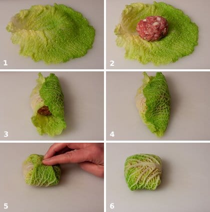 Forme aus der Hackfleischmischung kleine Kugeln, die gerade so groß sind, dass sie sich in ein Kohlblatt einwickeln lassen. Größere Blätter bekommen eine dickere Füllung, kleinere Blätter etwas weniger. Wichtig ist, dass sich das Kohlpaket komplett schließen läßt. Wahrscheinlich musst Du anfangs ein bisschen experimentieren, bis Du die Größe im Griff hast.