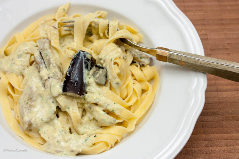 Das Orangen-Mandel-Pesto ist eine relativ süße Angelegenheit, die unbedingt ein geschmackliches Gegengewicht braucht: angebratene Auberginen sind perfekt, aber auch ein paar Radicchio-Streifen passen sehr gut.
